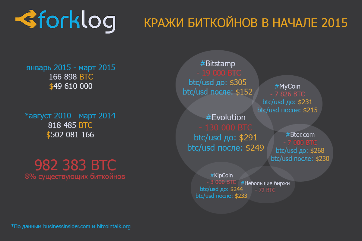 Forklog выделил лишь наиболее значимые хищения, произошедшие в этом году. Не стоит забывать о том, что в действительности похищенных биткойнов гораздо больше. Данные в инфографике по кражам с 2010 года также поданы с некоторой погрешностью. Однако, если делать выводы с учетом методической погрешности, можно отметить, что не менее 10% эмитированных биткойнов когда-либо были украдены.