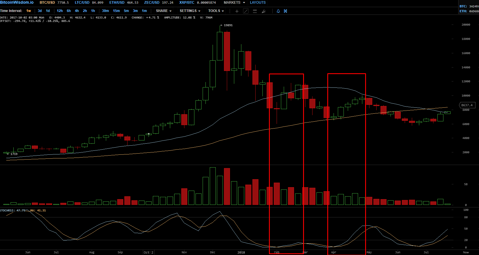 BTC/USD, недельный график — периоды кратковременного восстановления цены на фоне медвежьего тренда, сменявшиеся впоследствии еще более глубоким спадом