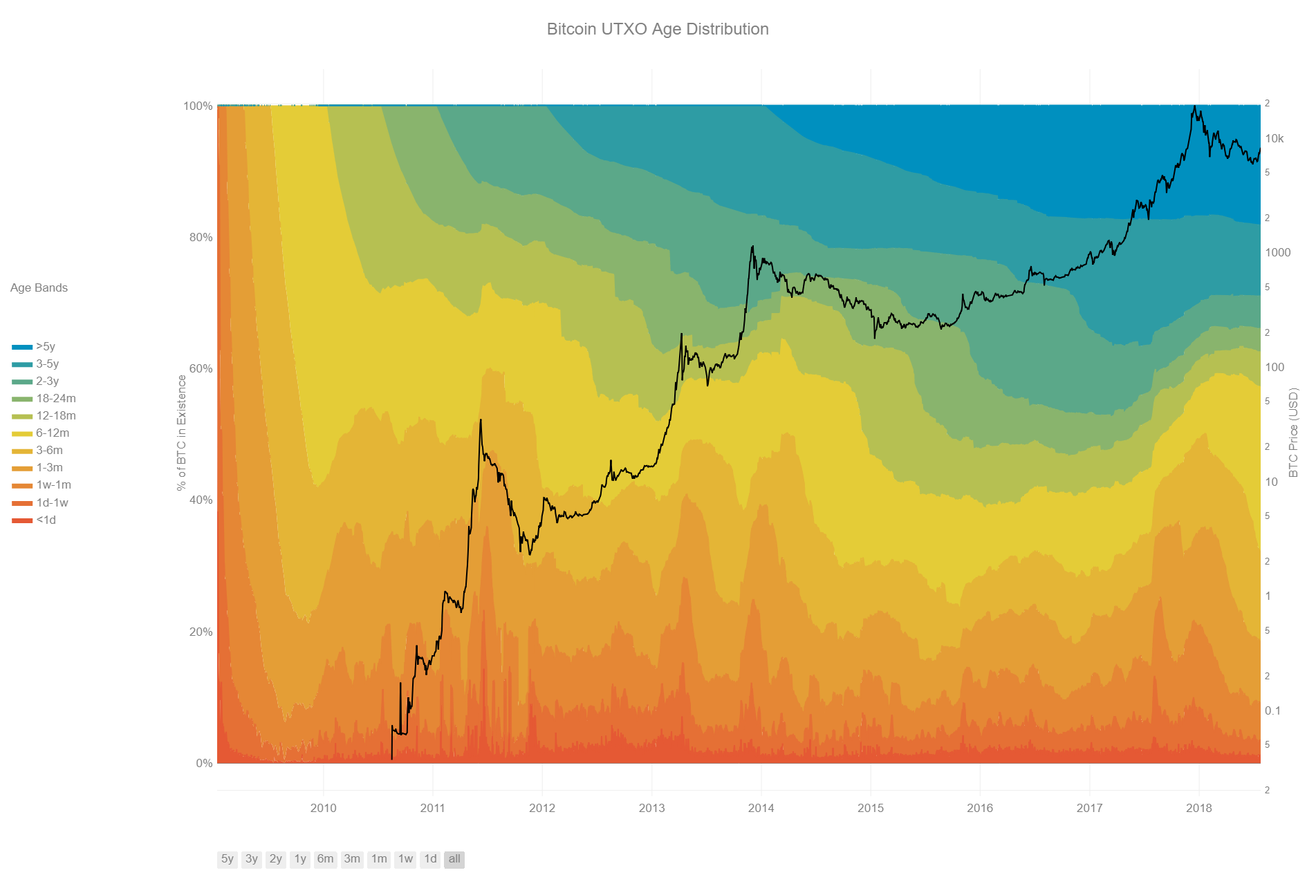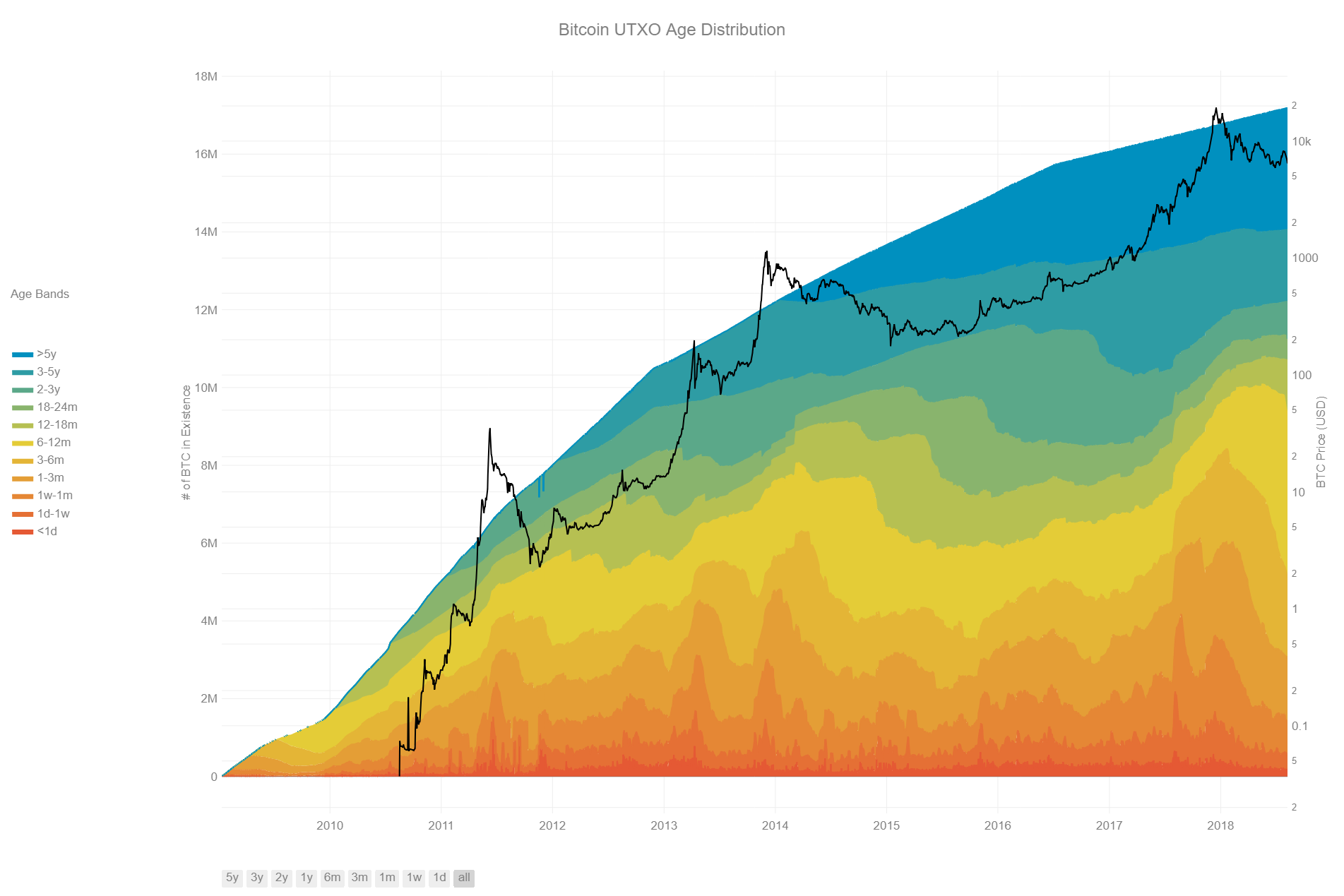 Цветные слои показывают удельный вес биткоинов, участвовавших в разные периоды времени в транзакциях (их «возрасты» отмечены в легенде графика). Так, нижние, более теплые цвета (красные, оранжевые), соответствуют биткоинам, транзакции с которыми осуществлялись совсем недавно. В то же время верхние, более холодные цвета (зеленые и голубые), обозначают биткоины, которые не участвовали в транзакциях на протяжении длительного времени. За все время монетарное предложение биткоина выросло с 50 до примерно 17 млн BTC. График был упорядочен в соответствии с количеством биткоинов на каждый определенный момент времени (левая ось Y). Черная линия показывает логарифмически сглаженную динамику курса USD/BTC (правая ось Y). Интерактивная версия графика доступна по ссылке.