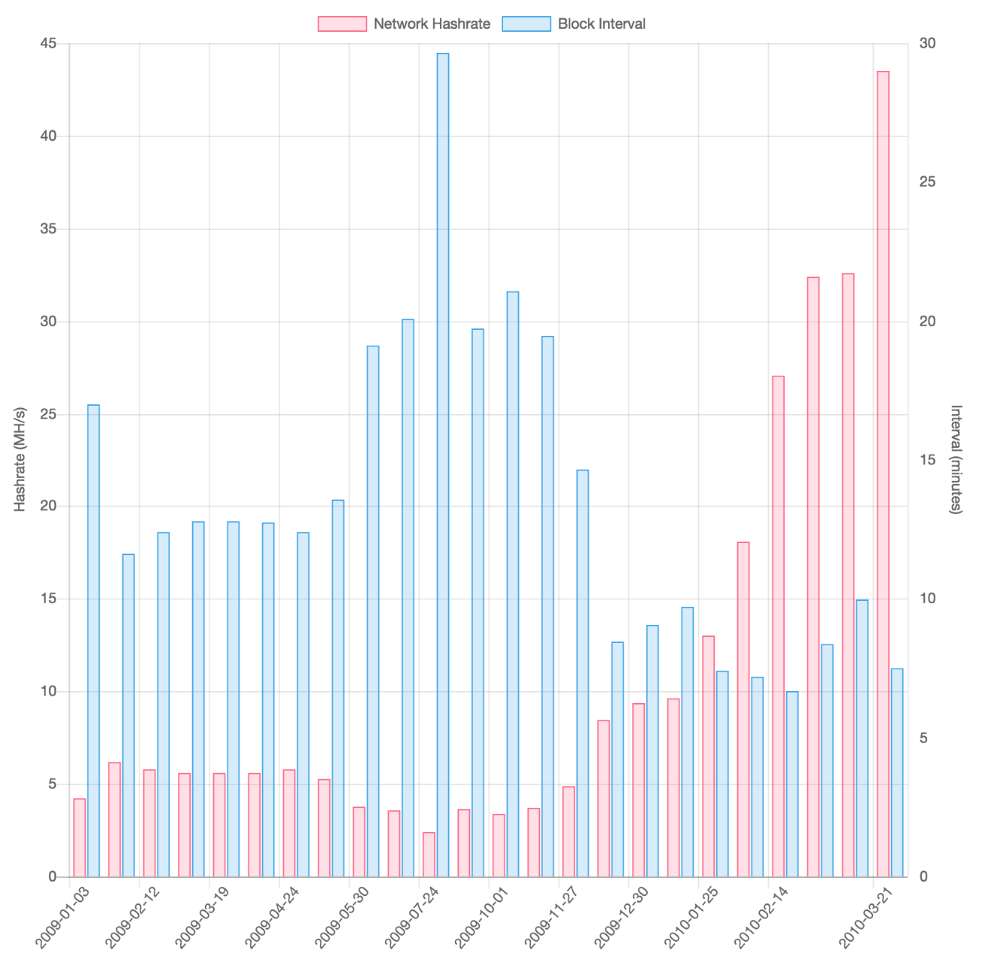 Диаграмма иллюстрирует хешрейт и средний временной интервал между блоками в течение 2009 — первого квартала 2010 гг. Вероятно, только Сатоши и несколько других небольших групп людей добывали биткоин в это время. Эти данные впервые появились в статье Эвана Клицке «Сколько биткоинов намайнил Сатоши Накамото?»