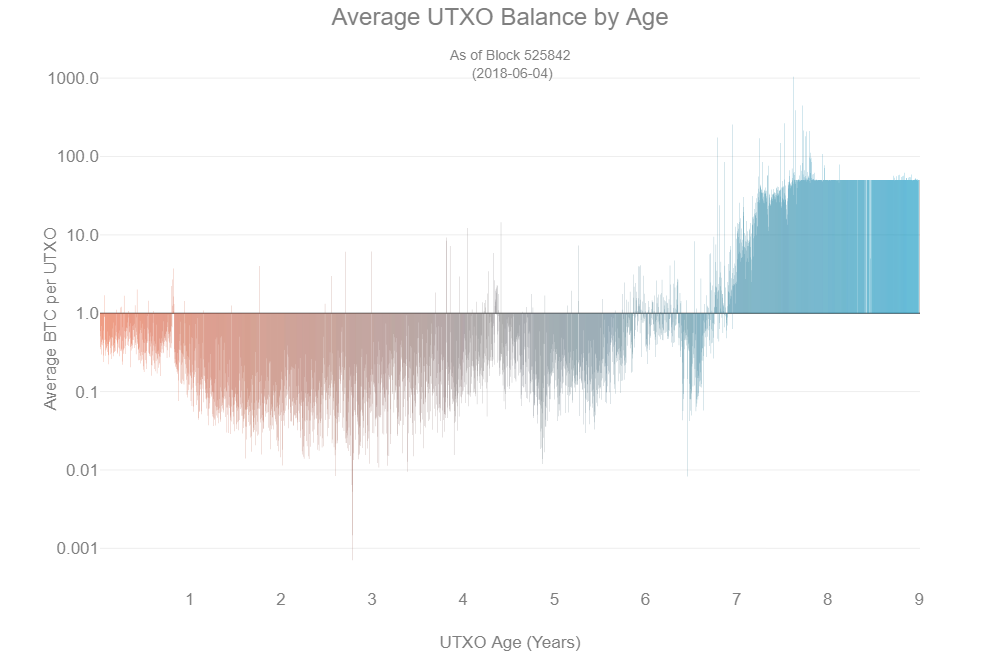 На этом графике сгруппированы теперешние UTXO по возрасту. Также вычислен средний баланс BTC, приходящийся на UTXO для каждой возрастной группы. Группа UTXO старше семи лет (примерно 1,9 млн BTC, добытых до 2011 года) изображена как «риф» в правой стороне графика. В то время награда майнерам за добытый блок составляла 50 BTC.