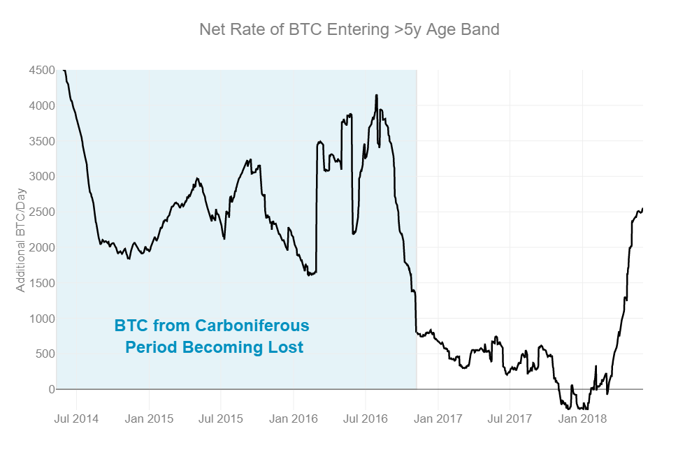 Вышеприведенный график описывает этот переход. В течение 2014-2016 гг (подсвечено синим) темп перехода BTC в категорию «за 5 лет» был чрезвычайно высоким. Этому соответствуют монеты, которые в последний раз участвовали в транзакциях на протяжении каменноугольного периода биткоина (2009-2011 гг). Тогда Сатоши и первые майнеры добывали монеты, многие из которых утеряны.