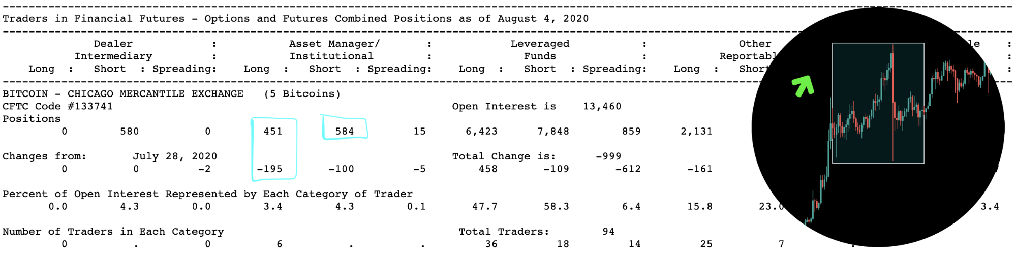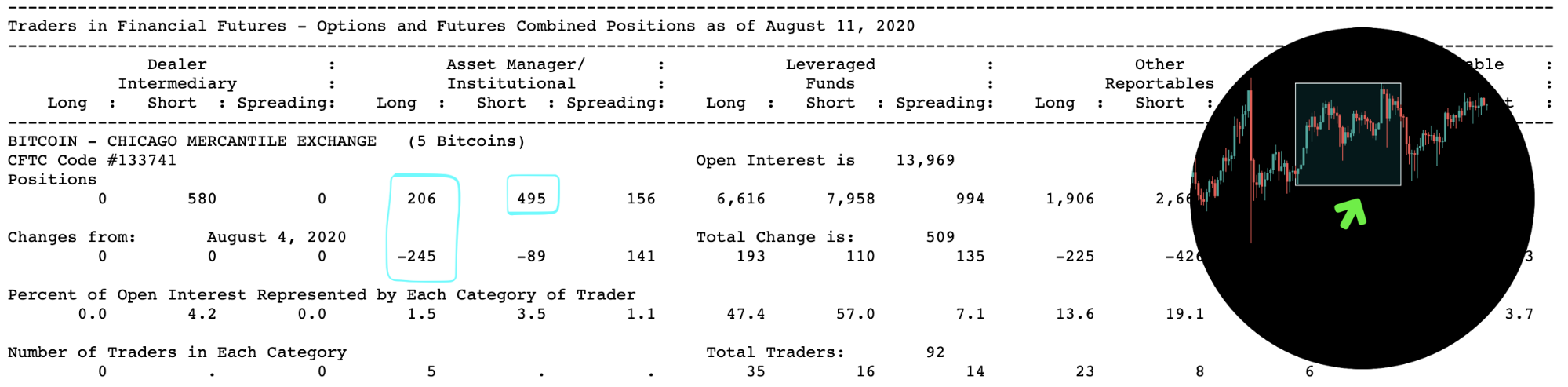 В COT-отчете с 4 по 11 августа в разделе Asset Managers более чем в два раза уменьшилось число длинных позиций (-245). Это говорит о том, что институционалы ожидают краткосрочного падения (коррекция после пробития уровня $10 000). Число коротких позиций у Asset Managers составило 495.