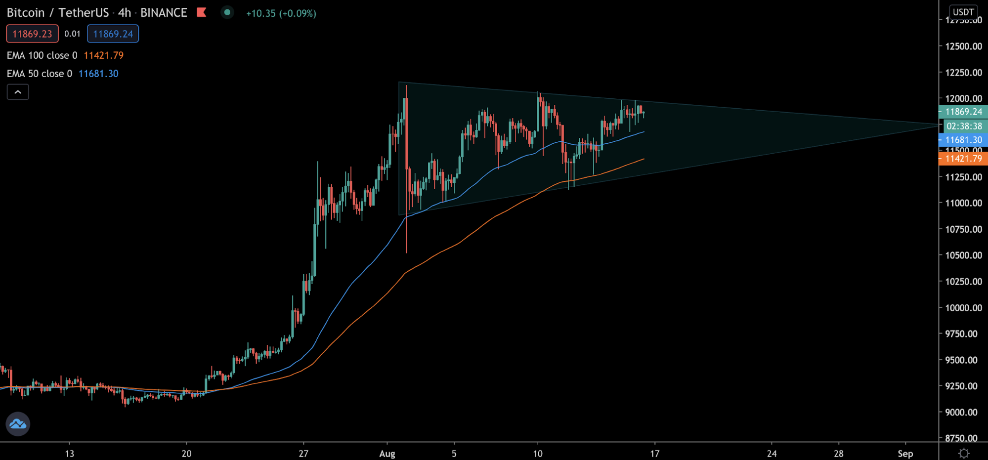 Цена сейчас движется в рамках паттерна «Симметричный треугольник», что говорит о консолидации (период слабого изменения цен после движения по тренду). Сейчас наблюдается борьба между продавцами и покупателями.