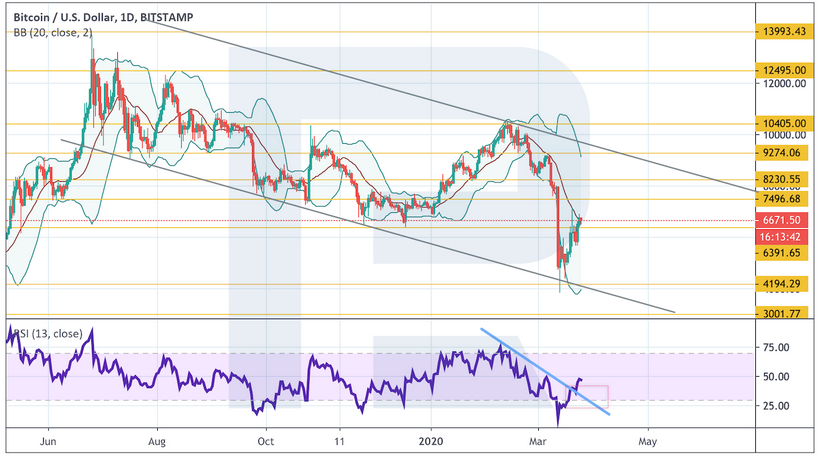На текущий момент есть все шансы увидеть продолжение роста к цели на уровне $9275. Сильным сигналом в пользу такого варианта выступает пробой нисходящей линии тренда на индикаторе RSI. На его графике есть потенциал для формирования разворотной модели «Голова и плечи», что тоже укажет на продолжение подъема цен.