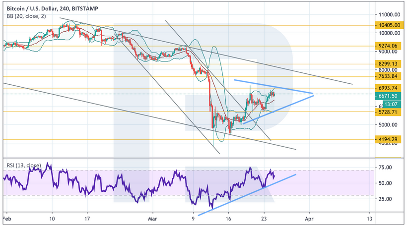 На 4-часовом графике цена тестирует область сопротивления на уровне $6995. Позитивном для дальнейшего роста уже выступает сам факт выхода котировок за пределы нисходящего канала. Сейчас же не стоит исключать коррекции цены к уровню $5725, и после этого — начала подъема.