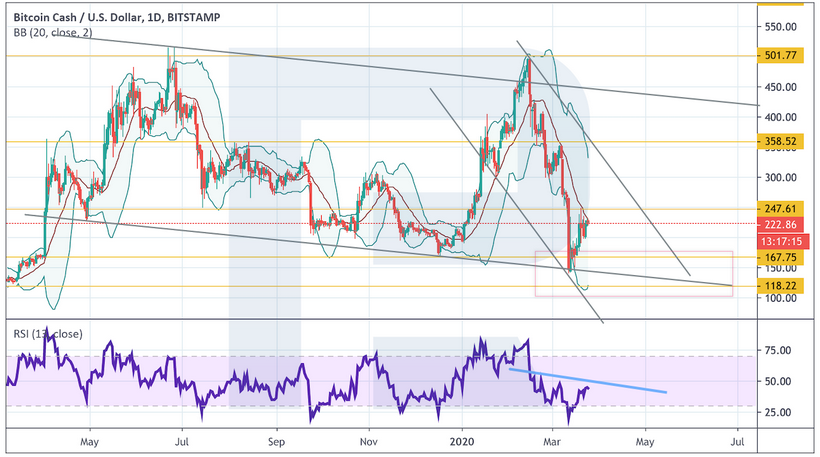 По Bitcoin Cash быкам удалось уйти на тест уровня сопротивления. На данный момент есть потенциал для формирования бычьей модели «Волна Вульфа» на дневном графике инструмента.