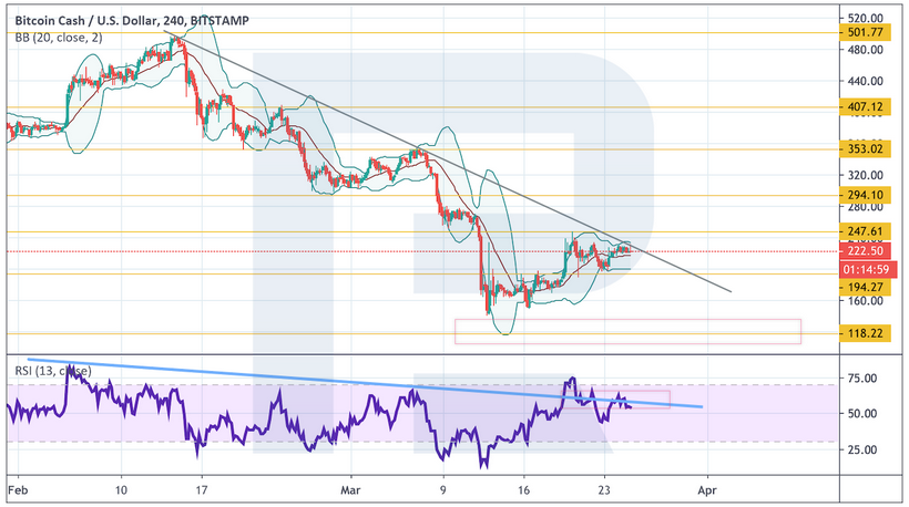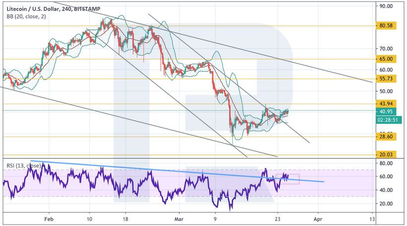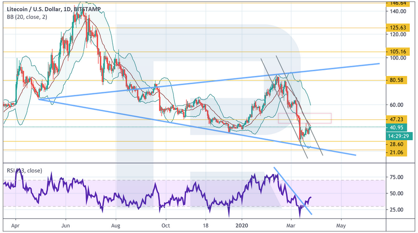 Сильным сигналом в пользу роста выступит пробой верхней границы нисходящего канала и закрепление над уровнем $47. Уже сейчас значения индикатора RSI пересекли линию сопротивления, что указывает на тест отметки $47 в ближайшее время.