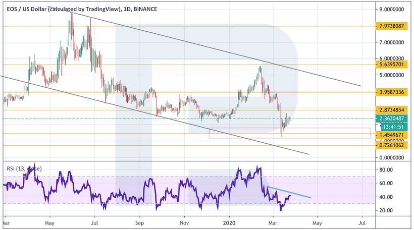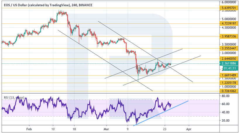 В случае пробоя уровня сопротивления и закрепления цены выше $2.65 стоит ожидать продолжения подъема к первой цели на уровне $3.25. В пользу такого варианта выступит и отскок от линии тренда на индикаторе RSI.