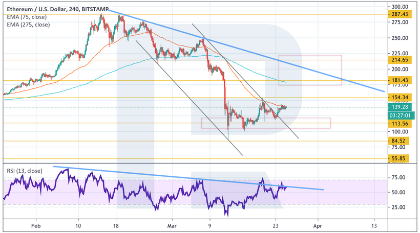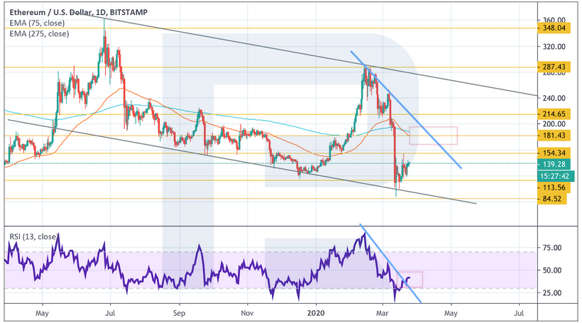 На дневном графике котировки Ethereum тестируют очередную область сопротивления. Скользящие средние уже пересеклись в пользу медвежьего тренда. В большинстве случаев цена возвращается в область между скользящими после начала новой тенденции, поэтому есть потенциал для роста к уровню $180.