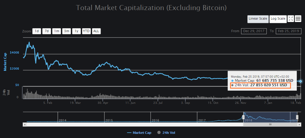 Примерно на таком уровне обороты бирж находились во второй половине января 2018 года, когда капитализация рынка была на максимальных значениях, а биткоин торговался гораздо выше чем сейчас.