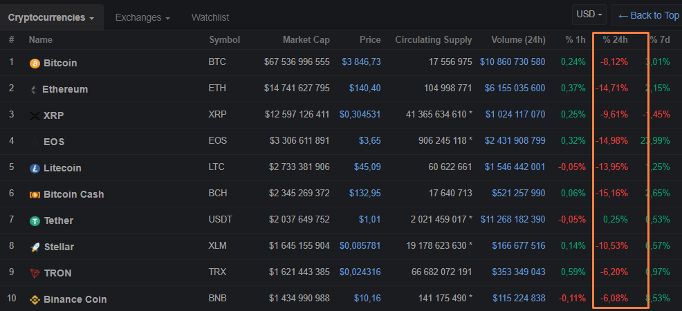 Вчера, 24 февраля, биткоин торговался выше $4100, но вскоре его цена без какого-либо фундаментального повода резко откатилась к отметкам ниже $3800. Падение первой криптовалюты потянуло за собой альткоины, многие из которых просели более чем на 10%:
