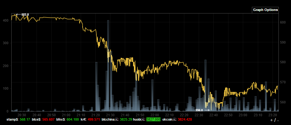 С приостановкой работы Bitfinex уже связывают и резкое снижение цены биткоина, которое можно наблюдать последние несколько часов. Если еще около 20:00 (Киев / Москва) криптовалюта торговалась чуть выше $600, примерно в 22:40 курс опустился до $556.