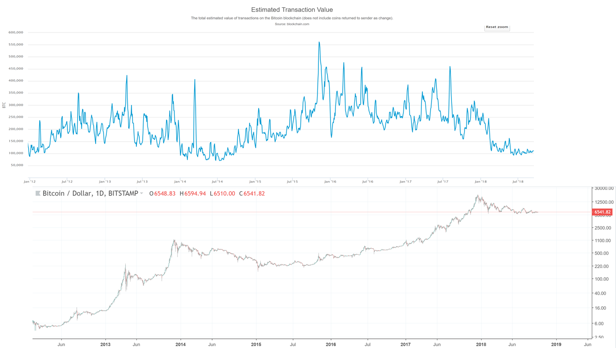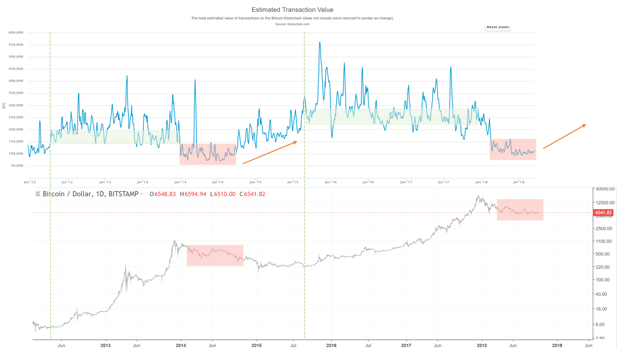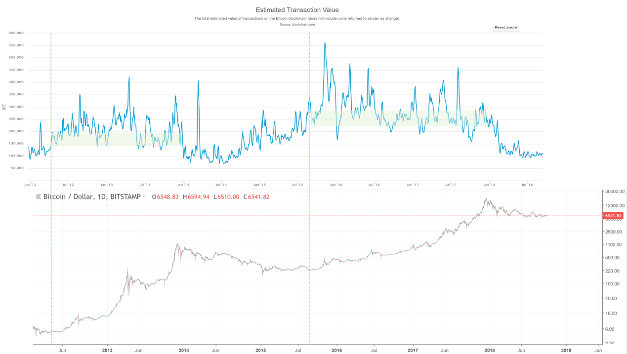 Сопоставив цену биткоина с дневным объемом ончейн-транзакций биткоина, мы увидим следующие паттерны: