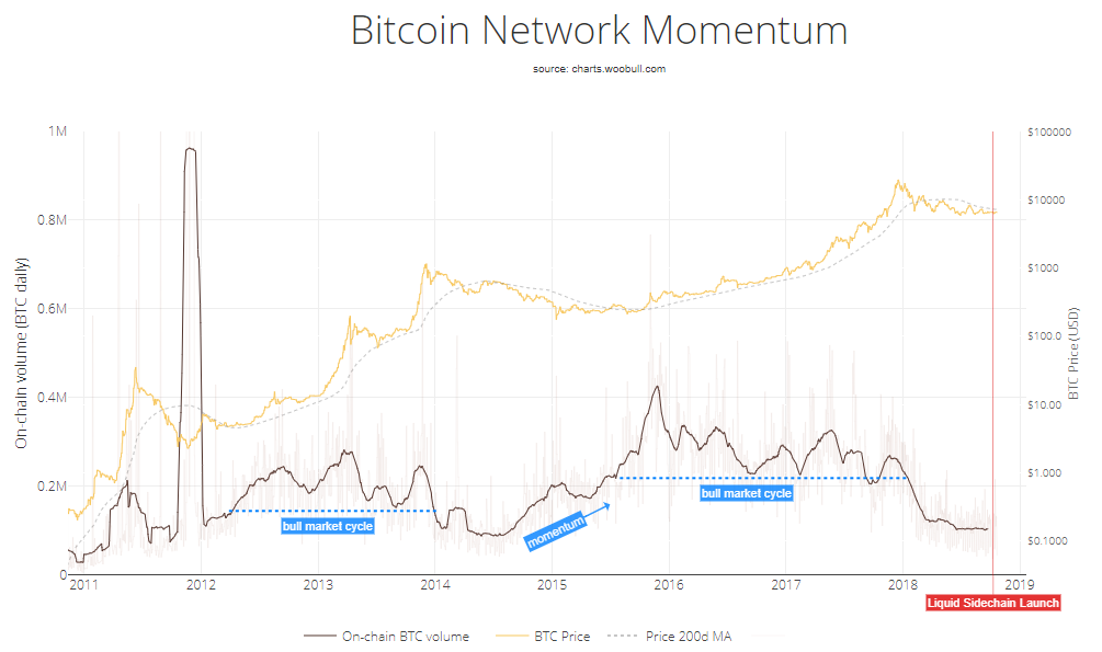 Важно помнить, что эта поздняя медвежья фаза должна наступить до того, как мы увидим существенный рост цены. Вот почему я начинаю беспокоиться, когда наблюдаю, как люди ждут, что цена биткоина немедленно рванет вверх на фоне новостей об институционалах, планирующих купить криптовалюту. Даже если они сделают это, нам все равно нужно, чтобы выраженный в BTC дневной объем транзакций достиг устойчиво здорового уровня еще до того, как цена существенно отреагирует на это.