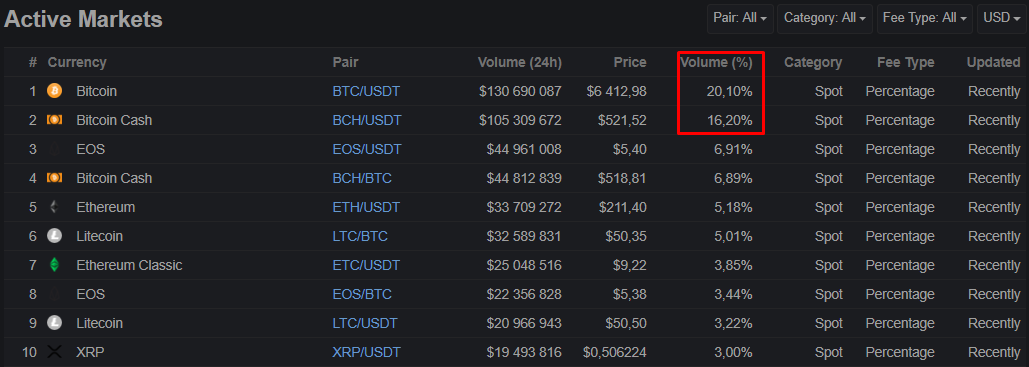 Самыми популярными валютными парами на OKEx являются BTC/USDT и BCH/USDT, обеспечивающие суммарно более трети от общего объема торгов этой платформы.