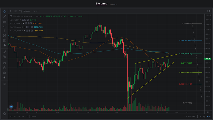 В четверг, 23 апреля, цена ведущей криптовалюты в ходе торгов достигла отметки $7750 (Bitstamp). Это максимальный уровень, до которого биткоин поднимался с обвала рынка 12-13 марта.