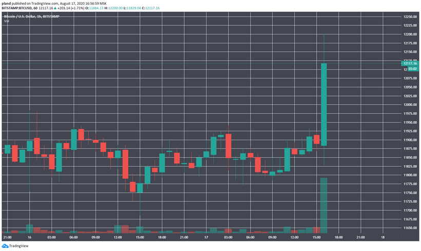 В понедельник, 17 августа, котировки первой криптовалюты пробили отметку $12 000. В моменте цена биткоина поднималась к уровню $12 200 (Bitstamp).