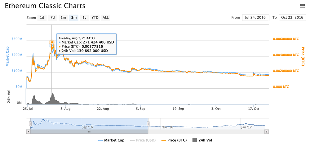 Arvicco: Никакого «инцидента с биржами» не было. Вернее сказать, он существует лишь в головах конспирологов из числа фанатов ETH, которые до сих пор уверены, что появление ETC — результат коварного заговора, а не следствие раскола Etherum-сообщества, часть которого категорически отвергла предательство принципов блокчейна. Некоторые биржи просто быстро увидели в появлении «альтернативного Ethereum» большую бизнес-возможность. Как оказалось, совсем не напрасно — дневной оборот по ETC в первую неделю торгов превзошел все остальные криптовалюты в истории, включая BTC. До сих пор ETC стабильно входит в пятерку самых активно торгующихся альткоинов.