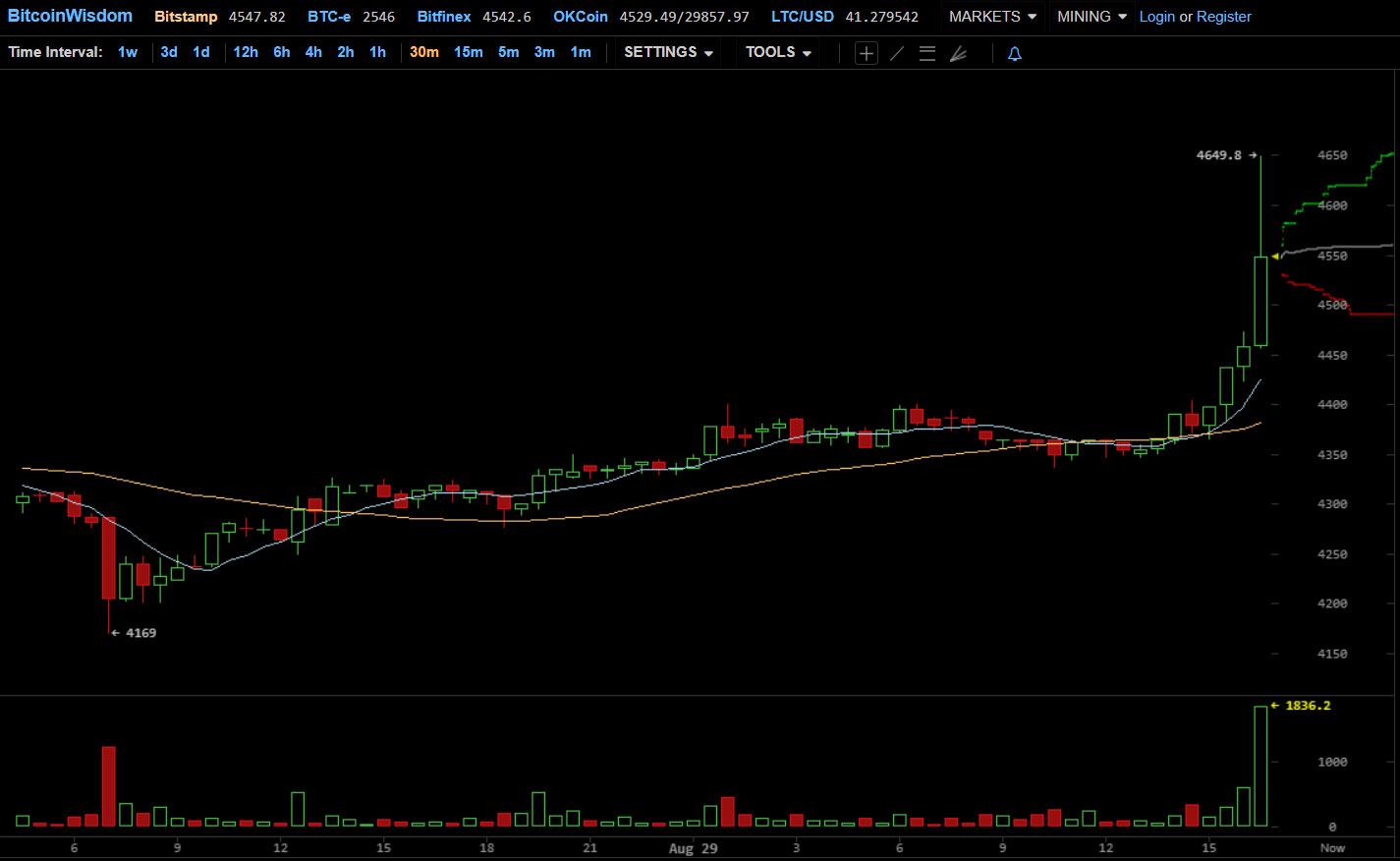 Во вторник, 29 августа, цена биткоина стремительно пошла вверх, уверенно преодолев отметку в $4600.