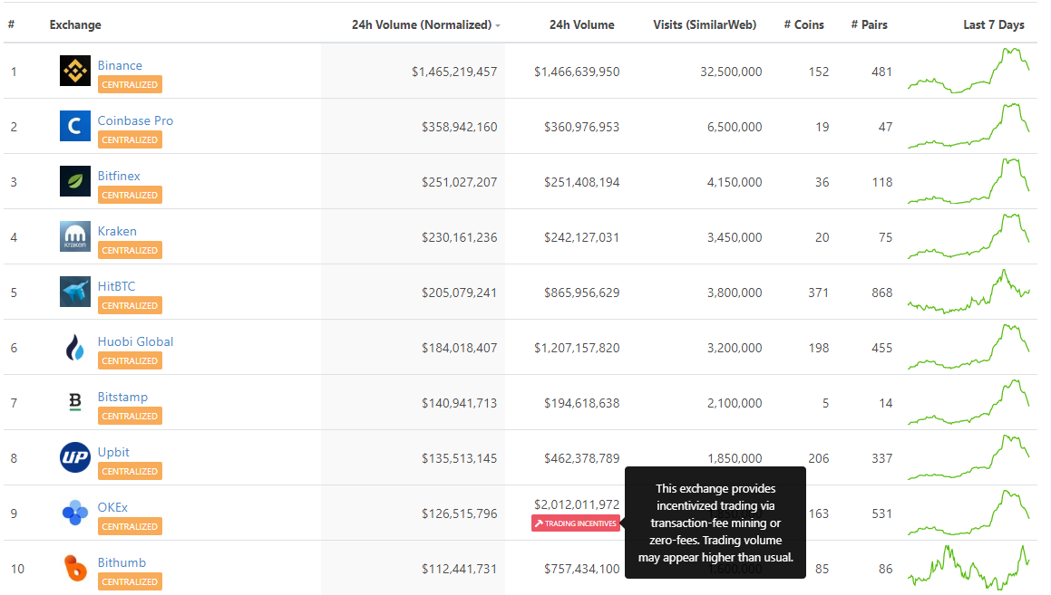 Как можно заметить, наиболее высокие объемы реальных торгов у биржи Binance. Чем ниже по списку, тем больше разница между скорректированным объемом торгов и заявленным. Например, биржа OKEx помечена как «использующая приемы вроде Transaction-fee mining, либо нулевые комиссии», следствием чего являются аномально высокие объемы торгов.