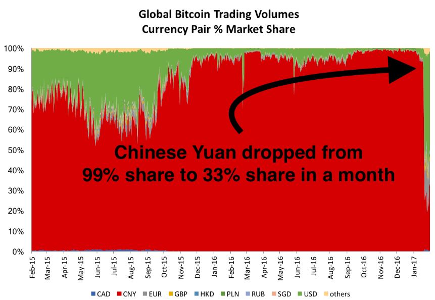Все это привело к тому, что всего за месяц доля юаня, ранее достигавшая 99% от общего объема биткоин-торгов, упала до 33%.