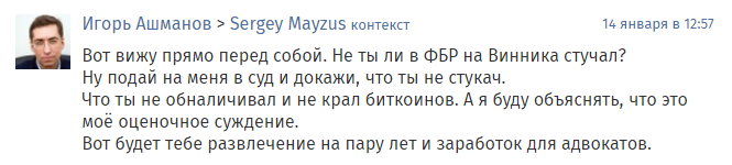 “I see one right in front of me. Wasn’t that you snitching on Vinnik to the FBI? Come on, sue me and prove that you aren’t a snitch. That you weren’t cashing out and stealing Bitcoin. And I will explain how this is my value judgment. A couple of years of entertainment for you and a job for the lawyers.”