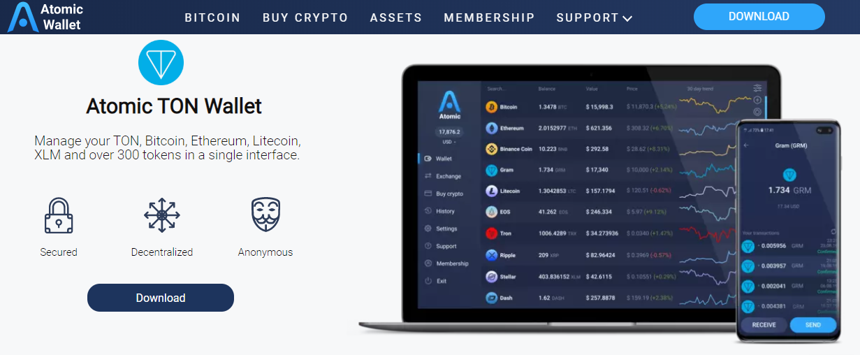 Atomicwallet.io web page advertising Atomic TON Wallet