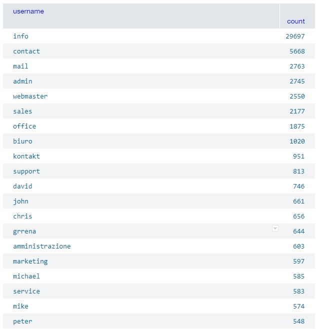 Out of the analyzed data, some of the passwords were dated 2011, but there was also a portion of new passwords and mail combinations created at the end of 2019. Among usual usernames and passwords, there were also rather exotic usernames, passwords, or not so usual usernames or passwords used with a number of different email domain providers.