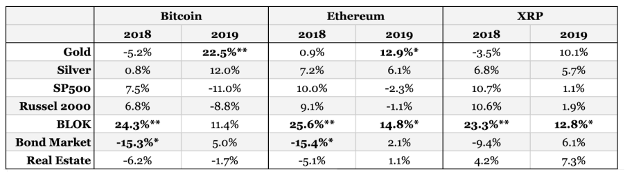 Last year Bitcoin’s price more consistently correlated with precious metals, less with the S&P 500. Source: The Block 2020 Research Outlook