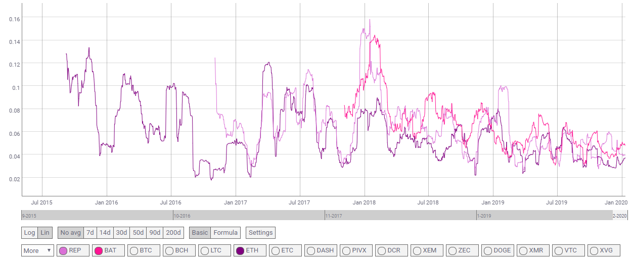 BAT, ETH, and REP volatility. Source: Coinmetrics