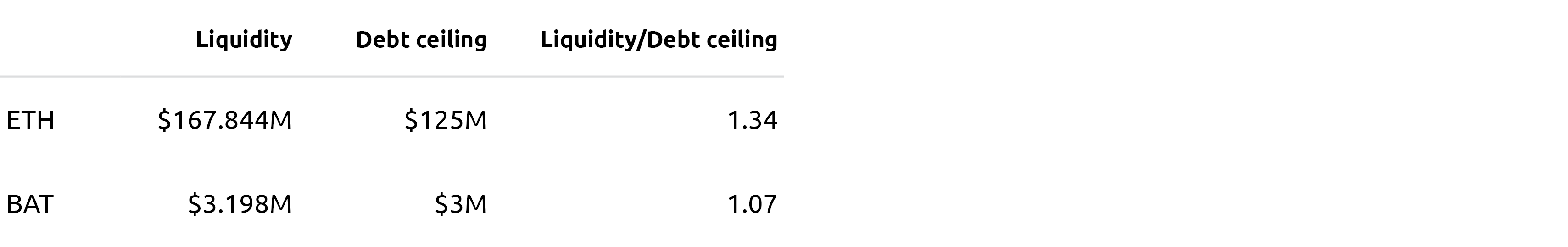 As BAT’s liquidity/debt ceiling ratio is lower than ETH’s, the current version of DAI is not more reliable than SAI by our second criterion as well.