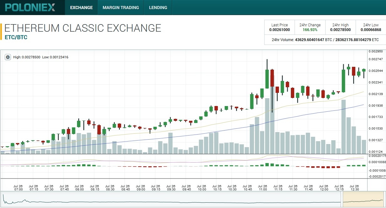 Сегодня цена ETC (Ethereum Classic) выросла на 320% и составила порядка $2.85 за монету. По объему торгов на бирже Poloniex, ETC занял первое место, опередив ETH. Это также отразилось и на капитализации актива, приблизив ее к отметке в $153 миллиона.