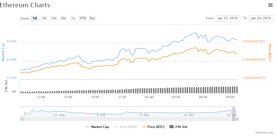 По состоянию на сегодняшний день капитализация ETH, согласно данным coinmarketcap.com, превышает $ 172 млн, в то время как показатель Litecoin составляет $ 141,5 млн. Более того, ETH вплотную приблизился к Ripple, рыночная капитализация которого составляет $174,7 млн.