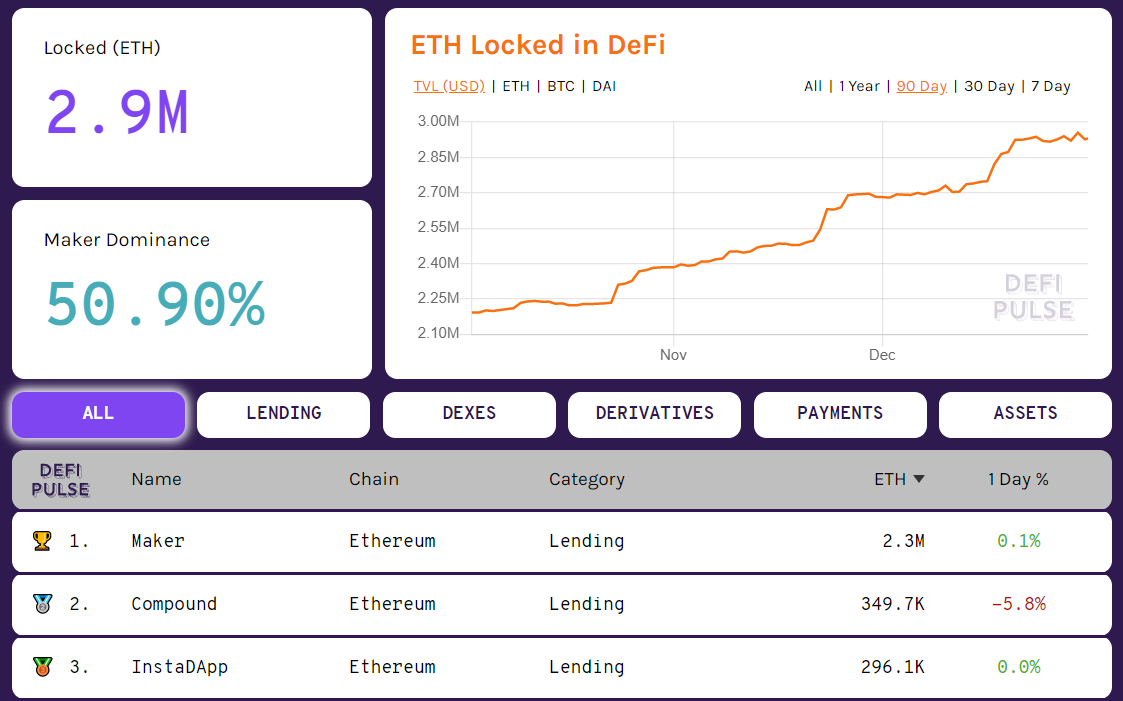 Абсолютным лидером в этом сегменте уже долгое время является Maker, на смарт-контрактах которого по состоянию на конец 2019 года было заблокировано 2,3 млн ETH (> $345 млн). Индекс доминирования этого сервиса в экосистеме DeFi при этом уже превысил 50%.
