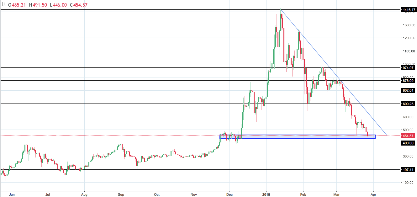 На данный момент признаков разворота устойчивого нисходящего тренда не наблюдается, цена вернулась к минимальным отметкам прошлой недели. Следующей логической целью для продолжения даунтренда станет психологический уровень $400.