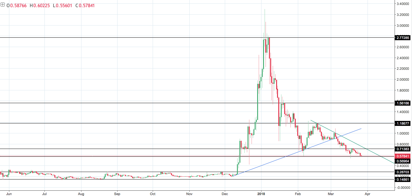 Уровень в районе $0,57 пока еще продолжает выполнять роль поддержки, но цена уже неоднократно пыталась закрепиться под ним и обновить минимум текущего года.