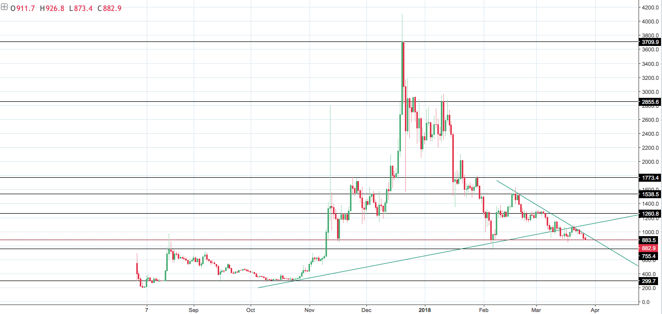 Bcash, не сумев закрепиться выше знакового уровня в районе $1000 и пробить наклонное сопротивление, движется к минимуму текущего года от 6 февраля.
