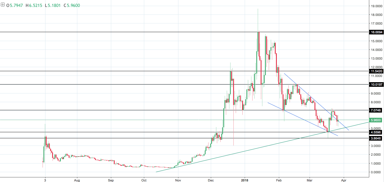 С точки зрения технического анализа уровень в районе $4,55 стал уровнем поддержки, оттолкнувшись от которого цена достигла $7 за монету. Закрепление над уровнем $7 откроет дорогу к дальнейшей цели в районе $9,5–10.