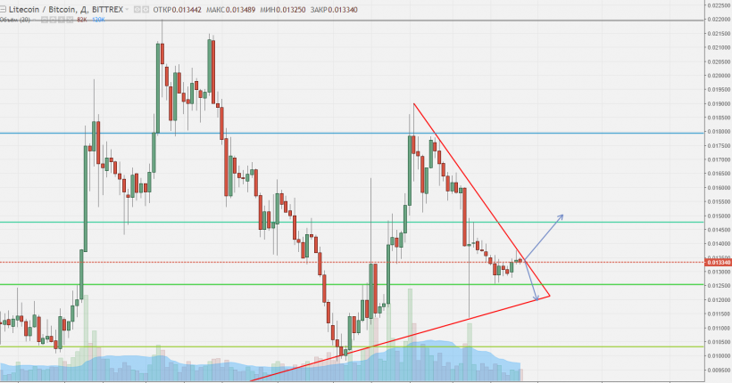 — LTC/BTC пробивает линию медвежьего тренда и начинает коррекцию на повышение. Здесь необходимо понимать, является ли это укреплением самого лайткоина или падением BTC. В случае, если это действительно укрепление, то после пробития можно покупать;