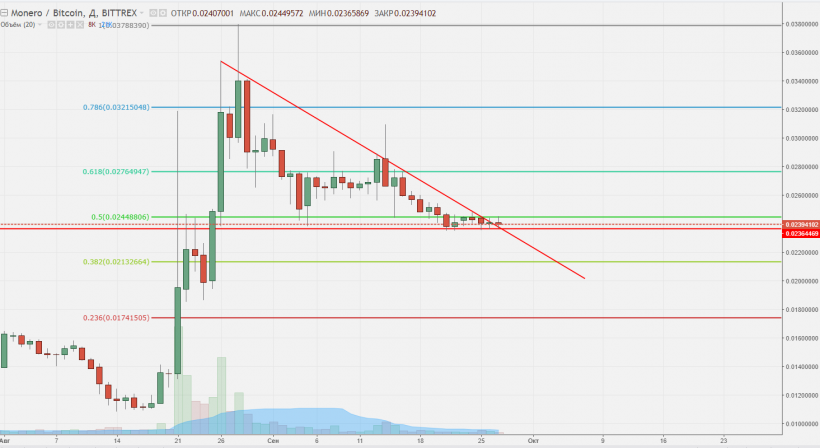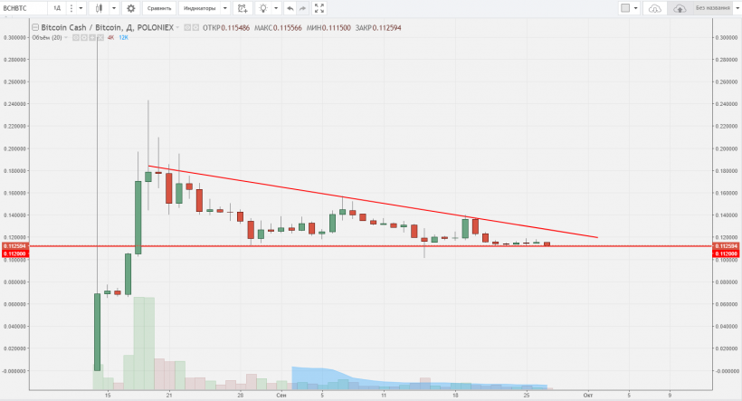 Один из форков биткоина, входящий в топ-5 по капитализации. Криптоактив находится в медвежьем тренде с начала сентября. Свеча Доджи от 15.09 отражает отвесное падение BTC на фоне новостей из Китая. На текущий момент волатильность небольшая: в данный момент актив пытается безуспешно пробить линию тренда. При подобной консолидации возможны несколько сценариев:
