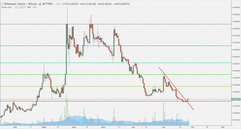 Форк Ethereum также не радует нас большой волатильностью. Недавнее пробитие линии нисходящего тренда можно списать на отскок от фибо-уровня 0,00297. В настоящий момент цена актива находится на уровне апрельских значений, и, учитывая полугодовую динамику, сейчас ETC/BTC выглядит достаточно привлекательным для покупки. Однако для уверенного входа в покупку лучше дождаться пробития уровня 0,0031, чего пока не происходит.