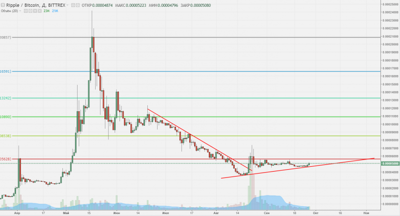 Ripple — одна из самых старых криптовалют, сейчас она показывает небольшую положительную динамику после середины августа. Произошло пробитие линии тренда, однако после этого актив торгуется во флэте. Потенциал роста у актива имеется, но не хватает инфоповодов для перехода в рост. Ближайшим уровнем интереса является 0,000056, после пробития которого можно говорить о переломе тренда и выходе из консолидации.