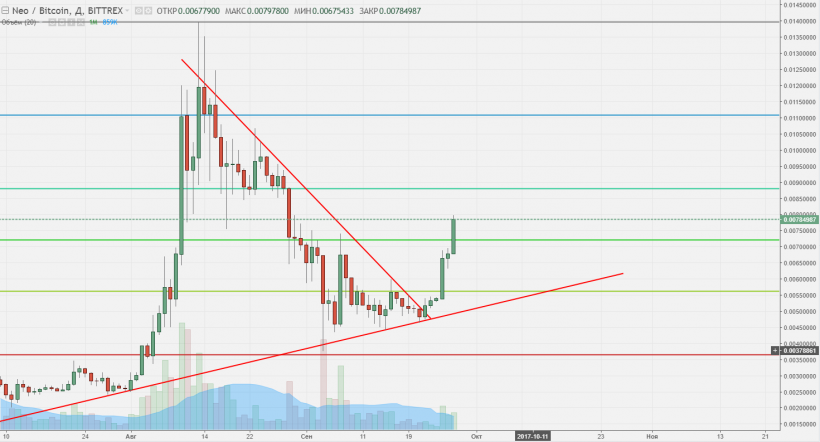 NEO показывает отличные показатели роста, пробив линию нисходящего тренда 23 сентября. Преодолев несколько ключевых уровней, актив стремится к следующему уровню в районе 0,0088. Отвесный тренд не может не радовать, но заставляет серьезно задуматься о коррекции, которая может произойти в ближайшее время. Можно рассмотреть возможность свинг-трейдинга, подождать коррекцию и найти точку входа. Осторожным трейдерам, скорее всего, следует зафиксироваться на 0,0088 при наличии позиций или немного подождать для оптимального входа в рынок.