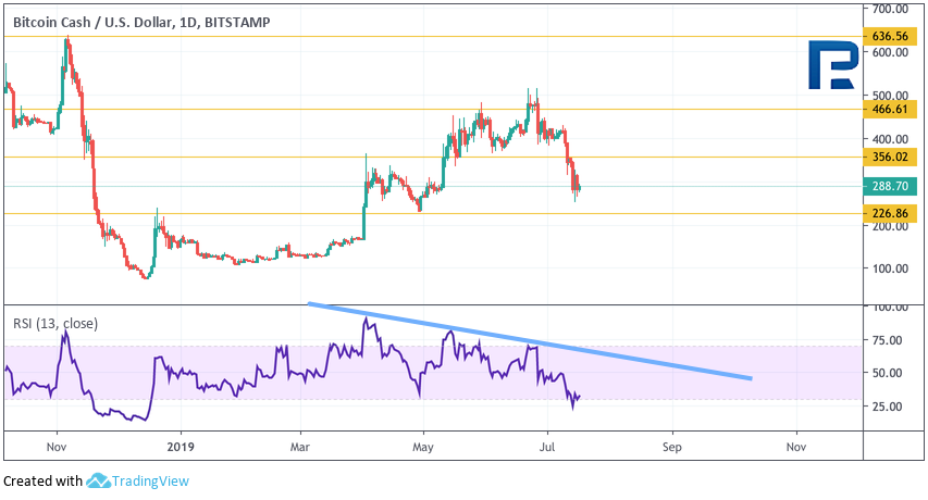 Дневной график криптовалюты Bitcoin Cash демонстрирует сильное снижение. Значения индикатора RSI здесь тоже протестировали области ниже уровня 30 впервые с конца 2018 года. Такой тест может указывать на вероятный разворот от уровня $225. Первой целью роста выступает уровень $355. Дополнительным сигналом в пользу подъема станет пробой нисходящей линии тренда на индикаторе RSI. Отменой такого варианта выступит пробой области $225, в случае чего целью падения выступит уровень $150.