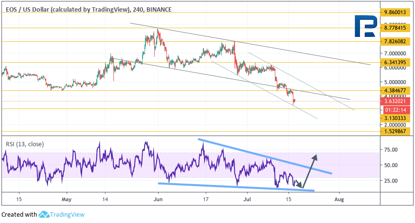 Технический анализ 4-часового графика EOS также указывает на потенциальный разворот с текущих уровней. В пользу такого варианта выступает формирование модели «Клин» на графике индикатора RSI. Подтверждением торговой идеи выступит пробой верхней границы модели с закрепление цены над уровнем $4,40, что укажет на возврат криптовалюты внутрь канала и продолжение подъема к первой цели на уровне $6,35. Отменой варианта с ростом криптовалюты может выступить продолжение снижения и пробой уровня $3,10. Это укажет на выход котировок за нижнюю границу нисходящего канала и ускорение их падения к цели на $1,50.