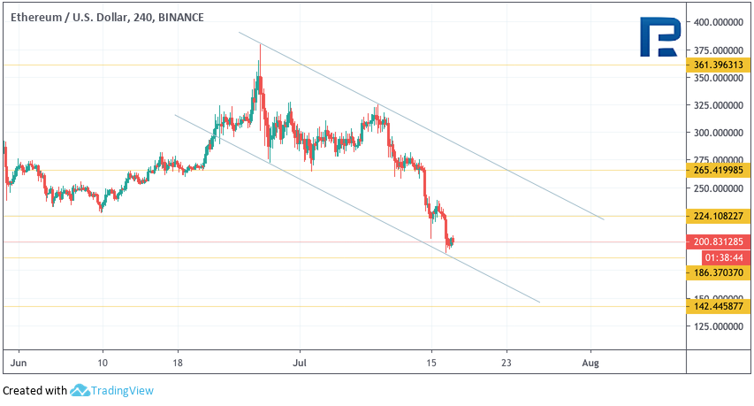 На 4-часовом котировки Ethereum тестируют нижнюю границу нисходящего канала. Текущая структура движения цены предполагает отскок и тест уровня $265, где ожидается разворот и продолжение падения с целью на уровне $185. В случае сильного роста и пробоя верхней границы нисходящего канала с закреплением над уровнем $280 стоит ожидать возобновления роста. Если же продавцы продолжат давление и смогу закрепиться ниже уровня $180 уже с текущих уровней, это станет сильным сигналом к продолжению падения без восходящей коррекции.