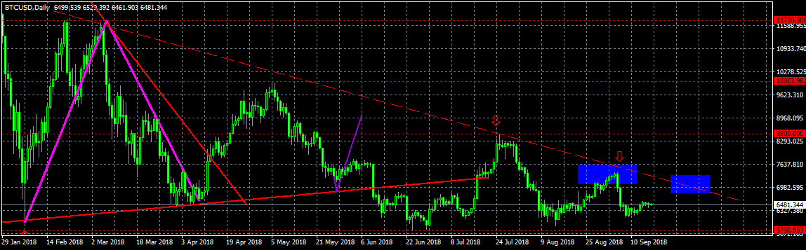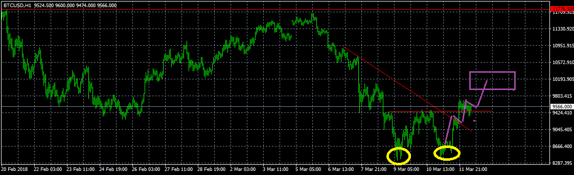 Ну и напоследок часовой график на сегодня. Вчера биткоин красиво нарисовал на этом таймфрейме «Двойное дно», после продемонстрировал импульсный рост и пробил локальную нисходящую трендовую линию. Сейчас происходит консолидация, ждем локальную волну вверх до уровня $10 100: