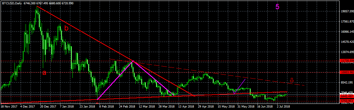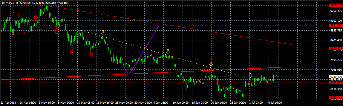 Небольшая амплитуда котировок говорит о том, что цена биткоина все еще находится во флэте, несмотря на очередную свечу с бычьим телом. Таким образом текущее движение можно отнести к коррекции в рамках снижающегося тренда, и пока не будет преодолена отметка в $7000, текущий рост продолжает быть неубедительным.