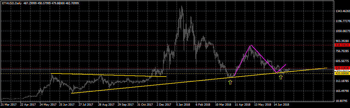 Ethereum не хватило буквально 5 долларов до обозначенной в прошлых выпусках аналитики цели в $500. Покупка от глобальной поддержки очередной раз оправдала себя, и трейдеры получили порядка 20% прибыли за довольно короткий период. На текущей неделе ожидаю штурм отметки $500.